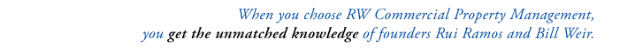 Before forming RW, Rui (above, right) spent nearly 30 years providing leadership in operations, building systems, tenant services, and contract negotiations for a handful of well-known property management companies. He has a special interest in energy systems and management, and tenant satisfaction programs. Bill (above, left) started his career in operations at a major office tower in Calgary, Alberta before moving to Toronto in 1985. He’s particularly proud of the time he spent in a challenging position as Manager of Engineering and Technical Services at a world class sports and entertainment complex with a retractable roof. In 1999, Bill teamed with Rui to manage the Toronto commercial portfolio for an Ontario-based development and management company. In 2002, the two joined to form RW, a full-service commercial property management company. Bill and Rui have done it all, with skill and with pride. Throughout their careers they have developed both the technical know-how and business expertise to protect and develop your asset. |